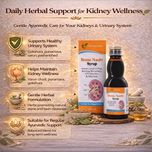Stone Nasht Syrup is a carefully crafted Ayurvedic proprietary medicine formulated to support kidney function and urinary tract health. Based on traditional Ayurvedic principles, this herbal syrup assists in managing discomfort related to kidney stones, urinary tract irritation, and associated symptoms.
